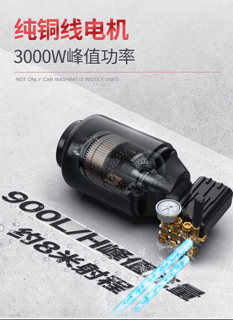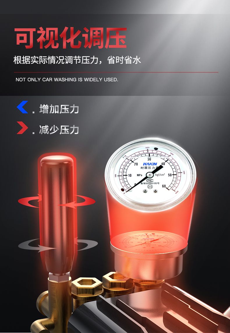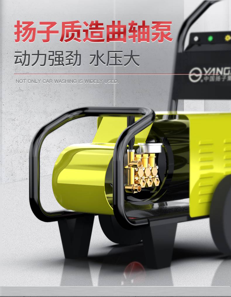 純銅線電機,3000W峰值功率;智能溫控,過熱保護;揚子質造曲軸泵,動力強勁,水壓大;自動啟停,節水省電,環保綠色;可視化調壓,根據實際情況調節壓力,省時省水。