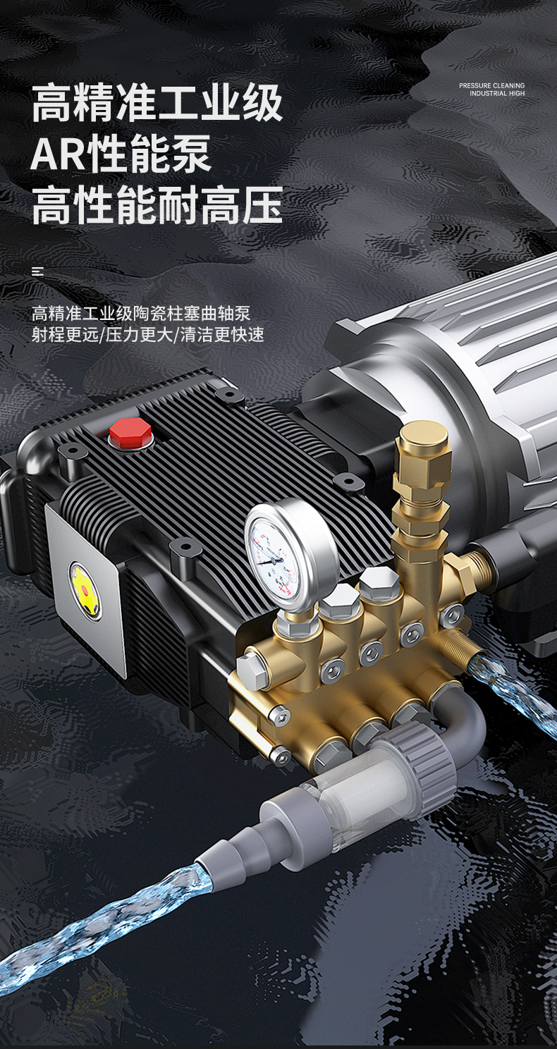 語音安全故障提醒,陶瓷柱塞曲軸泵,品牌變速箱,可視壓力調(diào)節(jié)系統(tǒng),壓力保護裝置,多種水型任意切換,密度進水過濾系統(tǒng),品牌雙缸強勁壓力,加厚橡膠減震輪胎